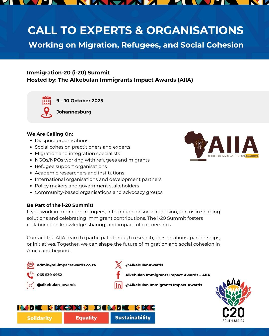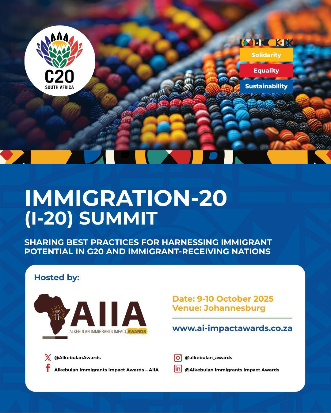 The Immigration-20 (I-20) Summit is a flagship initiative of the Alkebulan Immigrants Impact Awards (AIIA), created to position immigration as a catalyst for economic growth, social cohesion, and sustainable development within the G20 framework. Scheduled for 9–10 October 2025 in Johannesburg, South Africa, the summit coincides with South Africa’s G20 presidency and seeks to amplify the voices of immigrants and refugees in global policy dialogues.